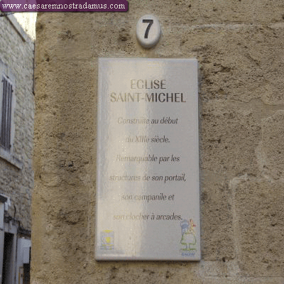 No podemos perdernos la iglesia Saint Michel situada en el centro histórico de Salon de Provence, entre la rue de bourg neuf, la Place Saint-Michel, al pie del Castillo del Imperio, prácticamente a unas calles de la mansión de Nostradamus, se erigió a principios del siglo XIII en medio de la ciudad medieval. Está orientada hacia el este, y a su vez a Jerusalén, por donde sale el Sol. El edificio presenta las características del arte de la Provenza, con su campanario y la sobriedad de sus decoraciones talladas que forman parte del románico de estilo sencillo, con gruesos muros y aberturas estrechas. La iglesia está iluminada por la piedra utilizada para el trabajo estructural. El pórtico esculpido adornando evoca al arcángel San Miguel aplastando las fuerzas del mal simbolizado por la serpiente. Si el aspecto general del edificio es típico del arte románico, las bóvedas de crucería de la nave y el ábside del otro lado es a semejanza del estilo gótico de la Provenza. Esta construcción sin duda fue visitada por Michel y su familia, en ella aún hoy persisten grabados y tallas dignas de la imaginería del fin de los tiempos. En su interior se pueden apreciar pinturas con significados ocultos y curiosos ídolos religiosos.