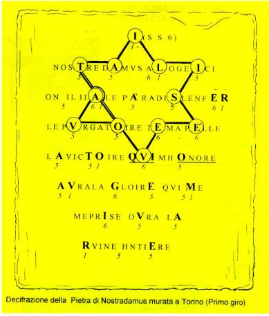 2* La lapida estaba colgada a un muro en una cantina subterránea cerca a la villa, ( extraña localización para una lapida conmemorativa ?). Esto claramente implica que la lapida talvez esconda un mensaje secreto dejado por M. NOSTRADAMUS, muy importante para la comprensión de las cuartetas, que probablemente preveía que habría sido descubierto solo al momento debido, probablemente... NUESTRO SIGLO?