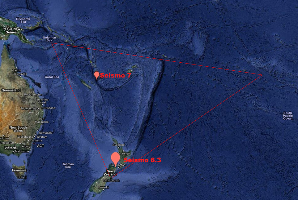 El 1 de Enero de 2011 alertamos sobre terremotos de al menos una magnitud de 7 entre los vértices de Islas Salomón, Nueva Zelanda y la Polinesia francesa.